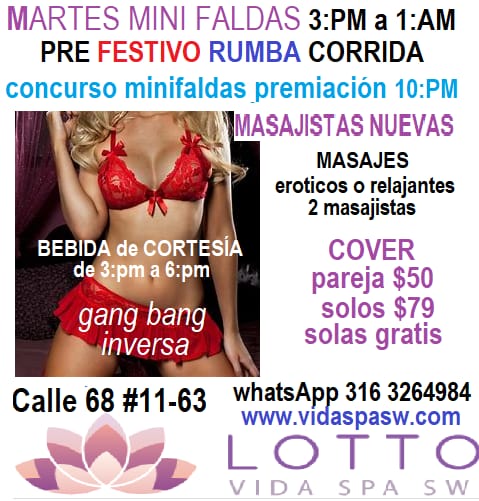 @sw_vida HOY tenemos rumba corrida hasta la 1.am, concurso de minifaldas, SOLAS ingresan gratis, MASAJES Eroticos o relajantes, 2 MASAJISTA NUEVAS, Gang Bang a la inversa, BEBIDA de cortesía de 3. Pm a 6.pm, sauna turco jacuzzi pic.twitter.com/Ix0FlOqH8r