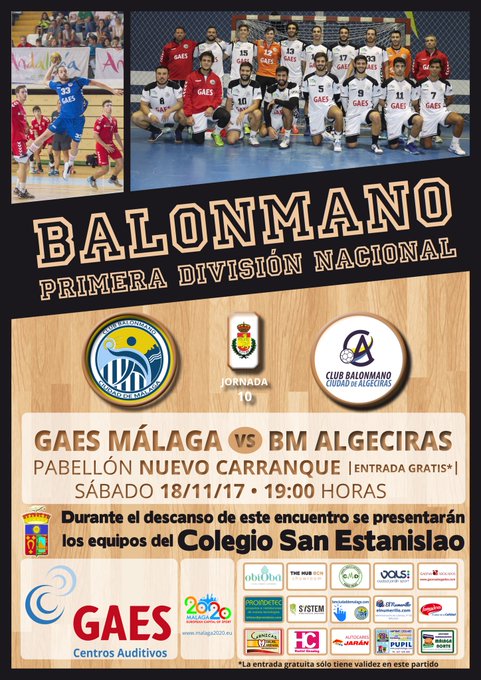 Vuelve la pasión por el #balonmano en el Pabellón Nuevo Carranque. Mañana sábado, partidazo de Primera entre el @Gaes Málaga y el Colomer Dental Algeciras @bmciudaddealgec. Ven a animar al equipo de #Málaga. Estarán con nosotros los chicos y chicas de @balonmanosek. 🕰19.00 horas pic.twitter.com/Frz4XWMrIk